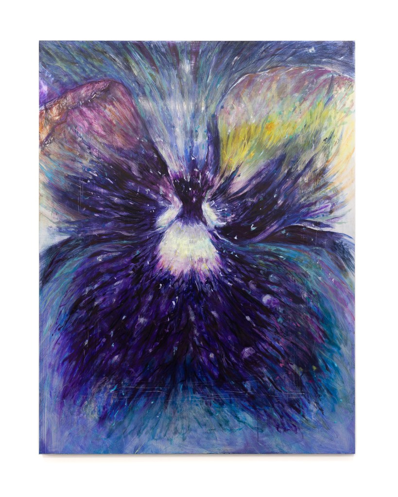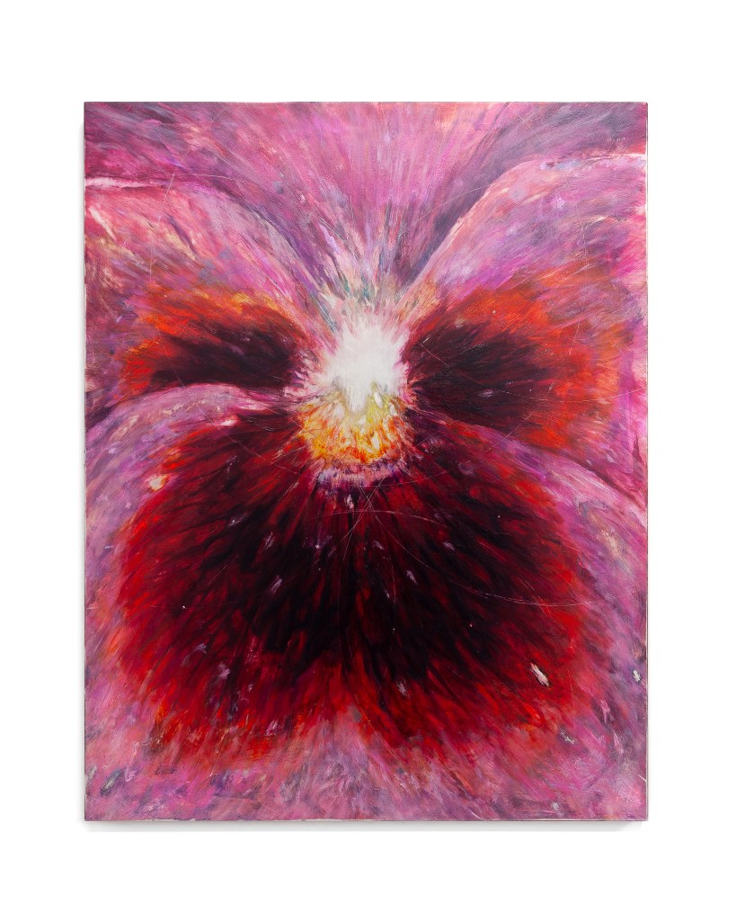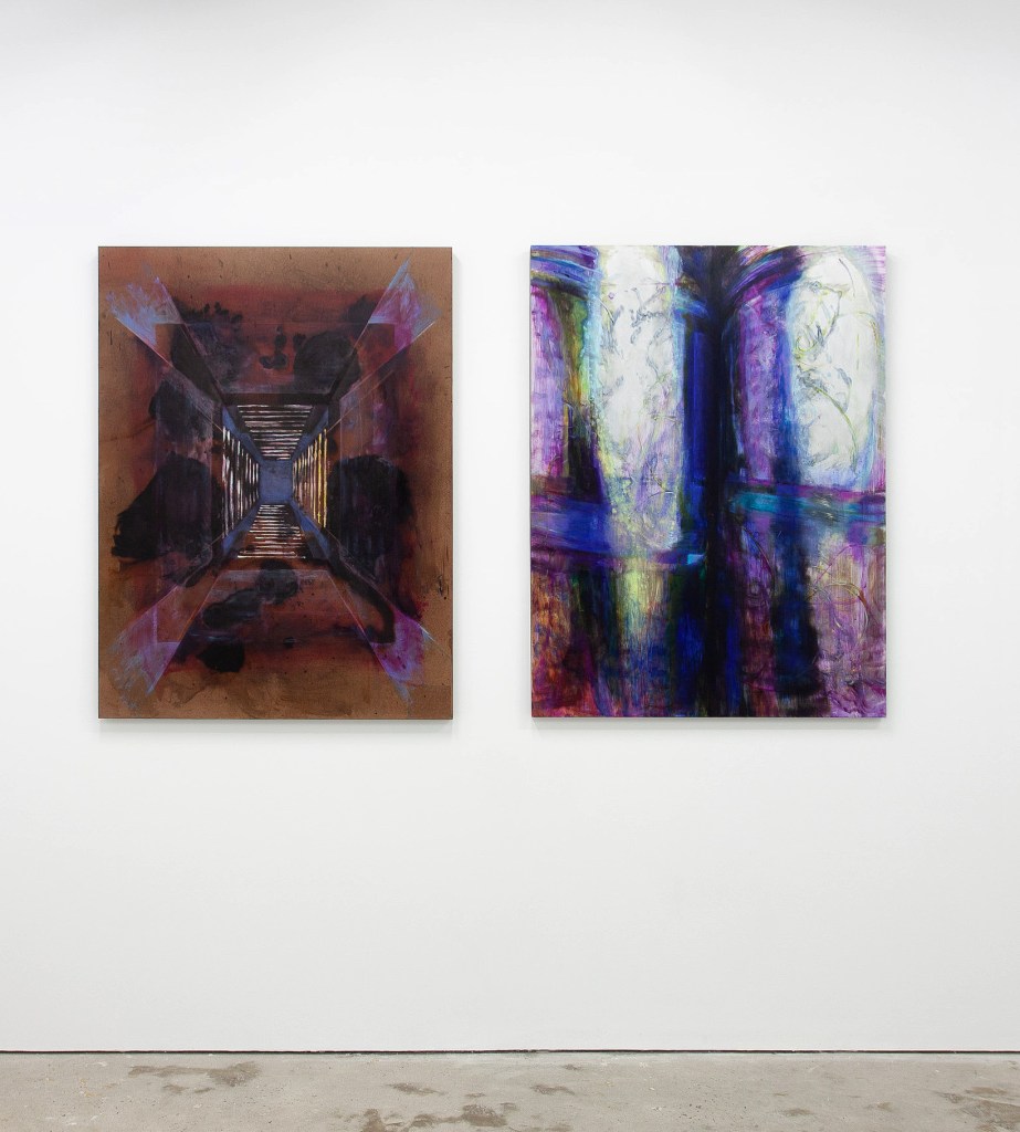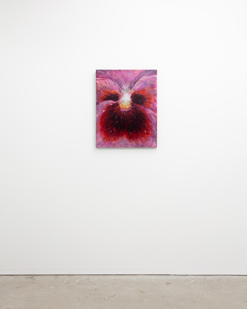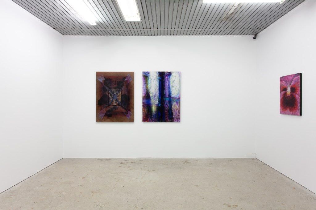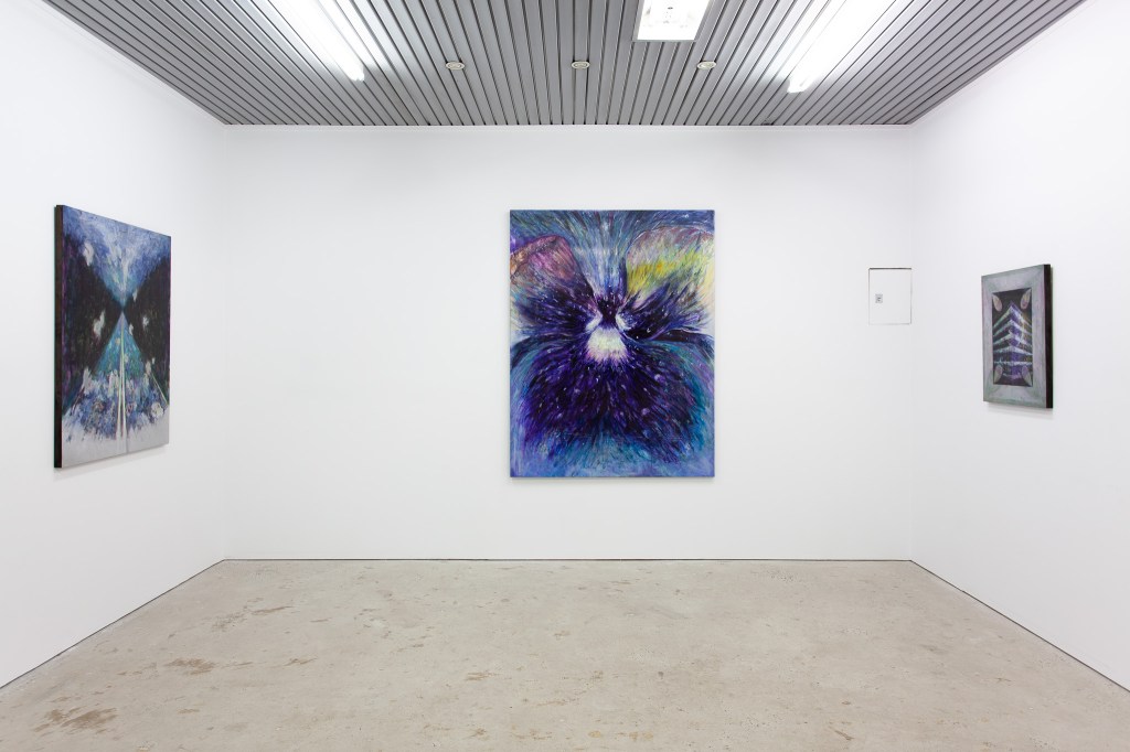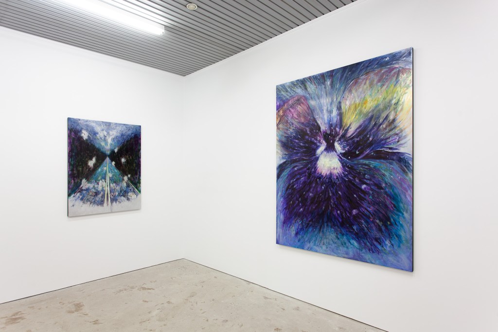 The works in Visualisation feature symmetrical, central compositions. The eye has no liberty: you’re yanked in and pinned right at the centre of the painting. In the mind of a naïve painter, this rigid gaze stands in for the sensation of sublime awe. It’s a tactless, ‘wrong’ compositional trope, something like the earnestness of a Friday night Swanston street busker mightily demonstrating a purity of spirit that can tear through all the phoniness, but using devices uncritically derived from phony, industry-engineered soaring pop. Tori is not a naïve painter. Her paintings deploy this wrongness to expose the barb under the plush fantasy of culmination.
