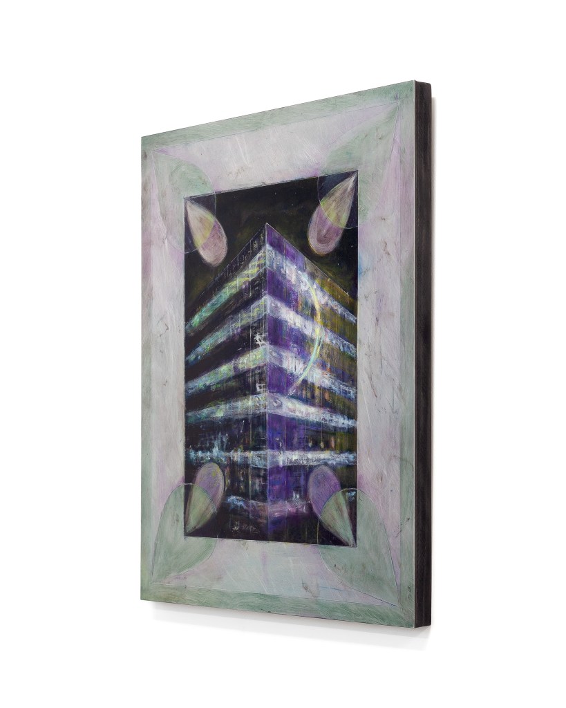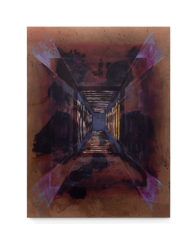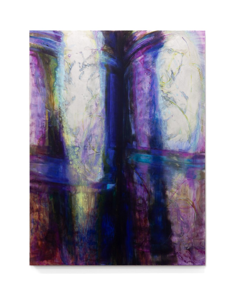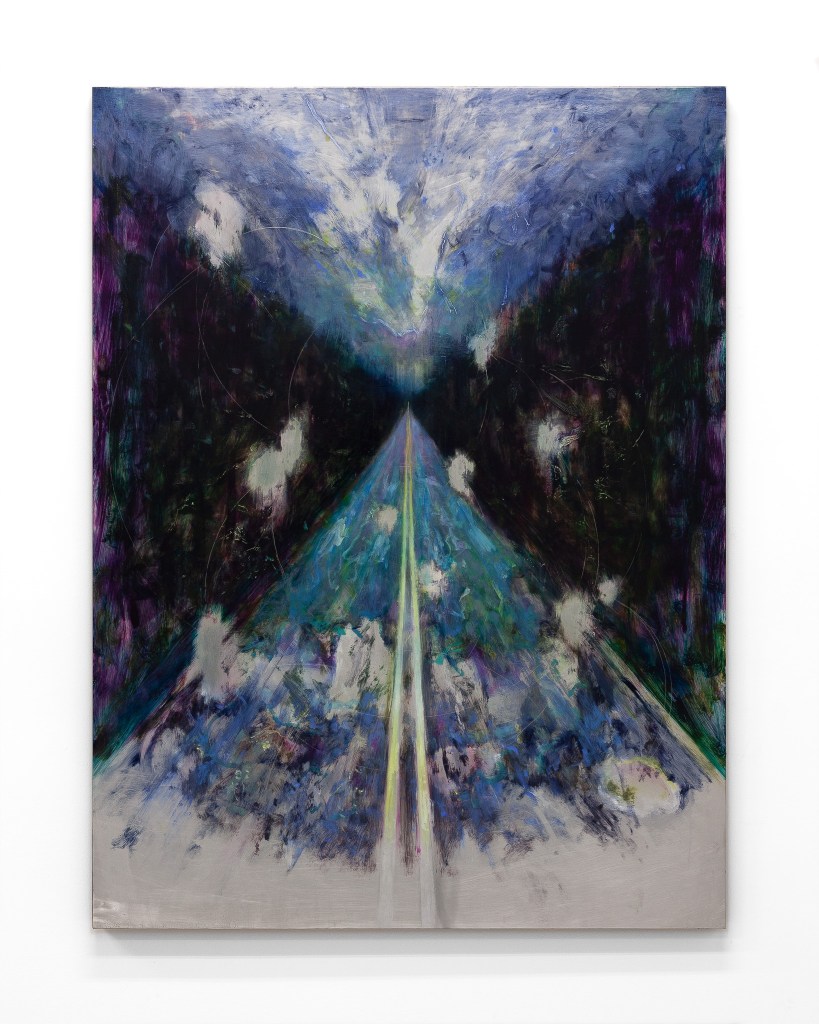 In Highway Hypnosis, the luminescent double unbroken lines lift slightly off the horizon, rhyming with the hovering eye the painting proposes as its point of view. The whooshing dynamism of astral projection is echoed again in Remote Vision. The acceleration in these paintings is facilitated by textbook one- and two-point perspective that addresses some disembodied transcendent cyclops. However, the fuel of this velocity is a reckless desire for something ultimate to be realised through the image. Tori amplifies the magnetism of this fantasy by further denying it. Her scratched up aluminium surfaces catch the light like the vandalised perspex of a bus stop shelter illuminated by passing traffic. Our sublunary bodies are on the outside of these totalising vortexes, trapped like flies against glass in a defaced and incompletable reality.